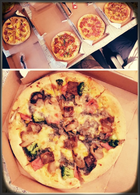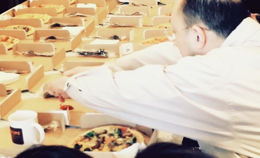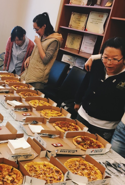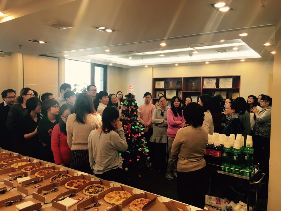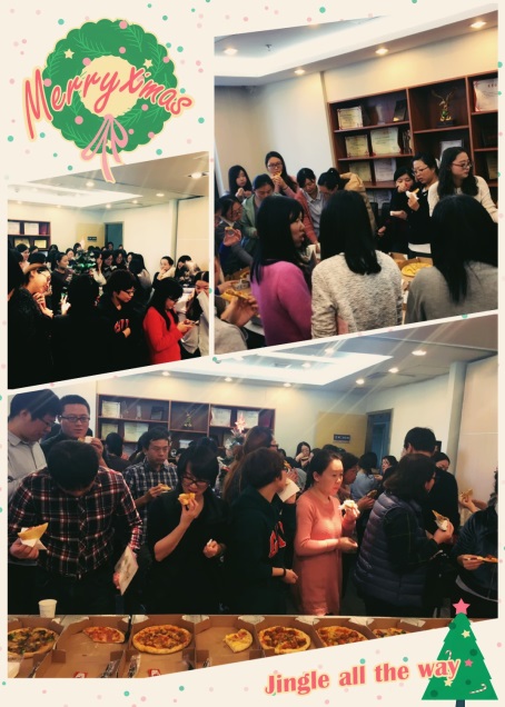 公司準備了多種口味的披薩,鋪滿了整個會議室。在"We wish you a merry Christmas"以及"Jingle Bell"的背景音樂中,大家一邊吃著一邊喝著一邊聊天,好一派其樂融融的景象。