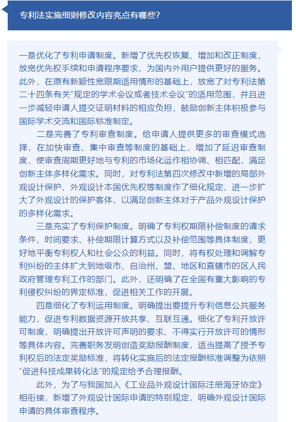 修改后的專利法實施細則共13章149條。修改的具體內容主要涉及五個方面:一是完善專利申請制度,便利申請人和創新主體。包括優化專利申請流程,細化局部外觀設計制度,放寬新穎性寬限期的規定,完善優先權相關制度等。二是完善專利審查制度,提高專利審查質量和效率。包括規范專利申請行為,完善實用新型、外觀設計審查制度,增加延遲審查制度,完善專利復審制度等。三是加強專利行政保護,維護專利權人合法權益。包括細化專利權期限補償制度,完善專利糾紛處理和調解制度,明確在全國有重大影響的專利侵權糾紛的界定標準等。四是加強專利公共服務,促進專利轉化運用。包括增加強制代理例外規定,提升專利信息公共服務能力,細化開放許可制度,完善職務發明相關規定等。五是加強同國際規則的銜接,推進高水平對外開放。包括明確外觀設計國際申請的法律地位和審查程序,在優先權要求、新穎性寬限期、分案申請等方面與國內的外觀設計專利申請制度作出銜接性規定等。